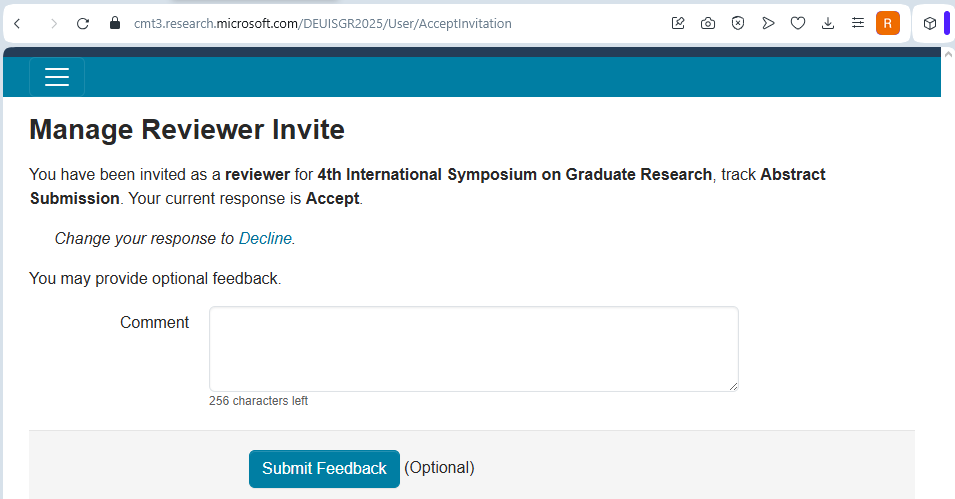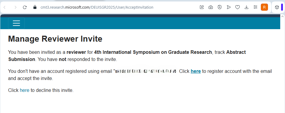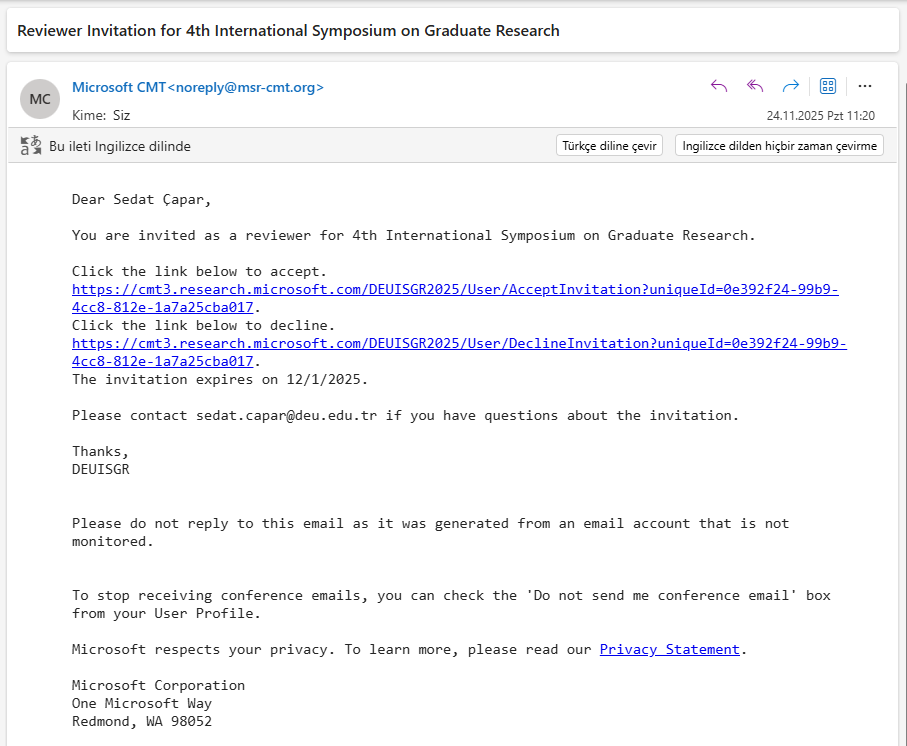 Reviewer olarak atandığınızda Microsoft CMT sistemi tarafından size otomatik bir davet e-postası gönderilir. Bu e-postada hem kabul hem de reddetme bağlantıları yer almaktadır.