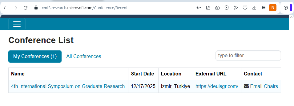 CMT, birden fazla konferansa/etkinliğe ev sahipliği yapan merkezi bir platformdur. Giriş yaptıktan sonra ana sayfada katılımcısı olduğunuz tüm etkinlikler listelenir.