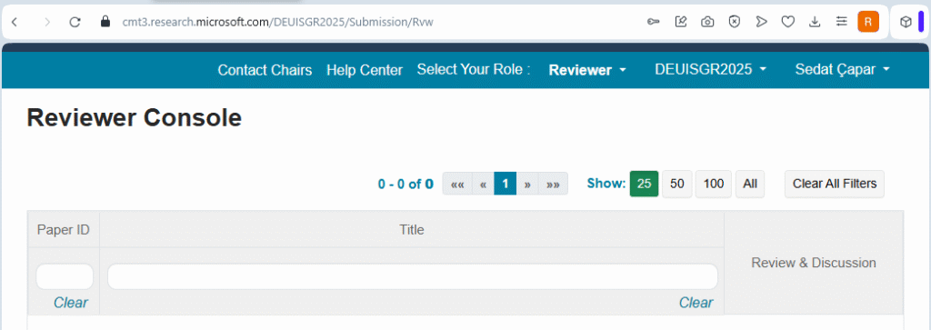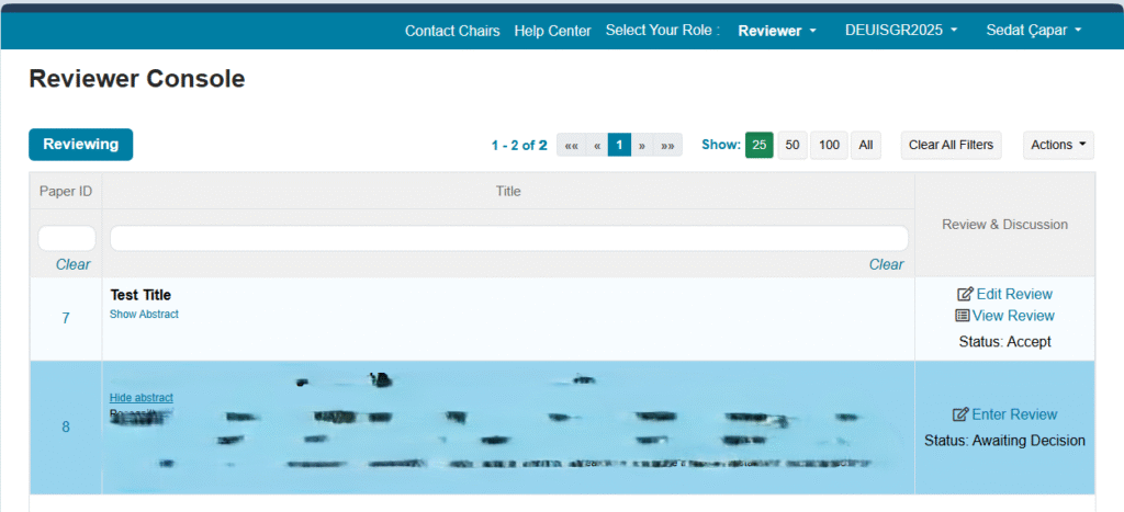 Reviewer Console, size atanmış özetleri inceleyeceğiniz ekrandır. Üstteki Select Your Role menüsünden Reviewer rolünü seçerek değerlendirme paneline erişebilirsiniz. Özet göndermek için ise Author rolü kullanılabilir. Sayfanın üst kısmındaki “Select Your Role” menüsünden rolünüzü Author veya Reviewer olarak değiştirebilirsiniz.