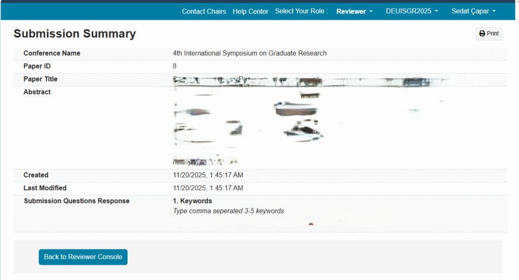 Reviewer Console’da listelenen bildirilerden ilgili Paper ID numarasına tıklayarak Submission Summary sayfasına erişebilirsiniz. Bu sayfada bildiriye ait başlık, özet (abstract) ve diğer bilgiler tam genişlikli bir görünümde sunulmaktadır. Özet incelemesi tamamlandığında, Back to Reviewer Console butonu aracılığıyla konsola geri dönebilir ve Enter Review seçeneğini kullanarak değerlendirmenizi sürdürebilirsiniz.