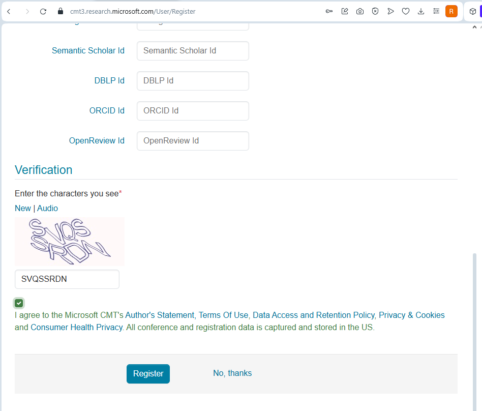 Sayfanın alt kısmında yer alan doğrulama (Verification) bölümünde ekrandaki karakterleri giriniz ve Microsoft CMT’nin kullanım şartlarını kabul ettiğinizi onaylayınız. Register butonuna tıklayarak kayıt işlemini tamamlayabilirsiniz. Kayıt sonrası e-posta adresinize bir doğrulama/aktivasyon mesajı gönderilecektir.