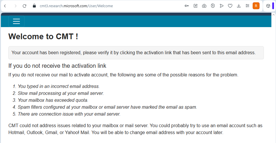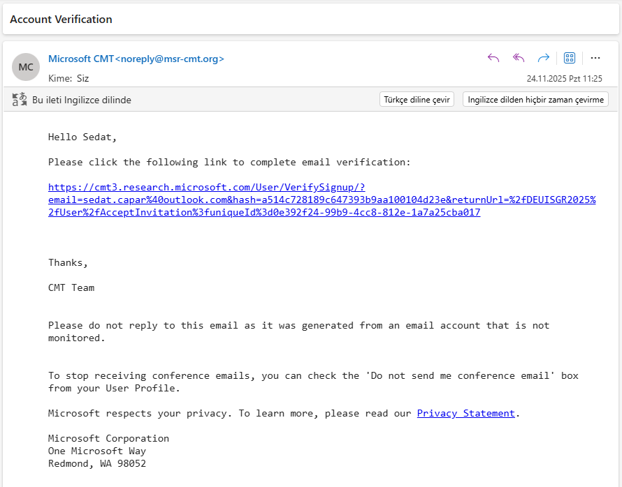 Hesap oluşturma işleminin ardından Microsoft CMT tarafından e-posta adresinize bir doğrulama mesajı gönderilir. E-postadaki “Click the following link to complete email verification” bağlantısına tıklayarak hesap aktivasyonunu tamamlayınız.