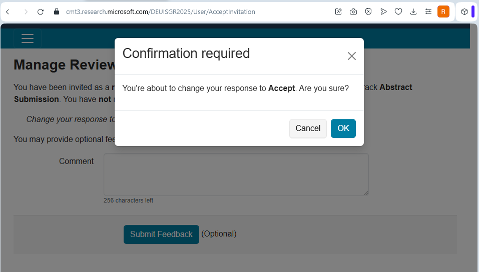 Hakemlik davetini onaylama ekranında Accept seçeneğini işaretlediğinizde bir onay penceresi (modal) açılır. Bu pencerede OK butonuna tıklayarak daveti kabul ettiğinizi doğrulayınız.